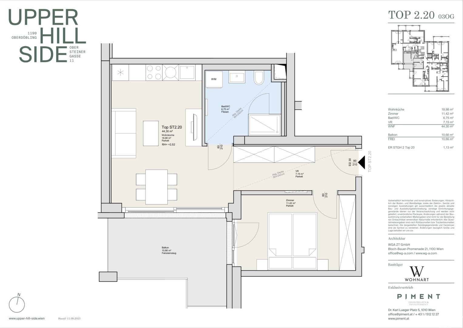 Room layout TOP 2.20, 3rd floor // Entrance hall // Bedroom // Bathroom (with sink, shower and toilet) // Living room and kitchen // Balcony