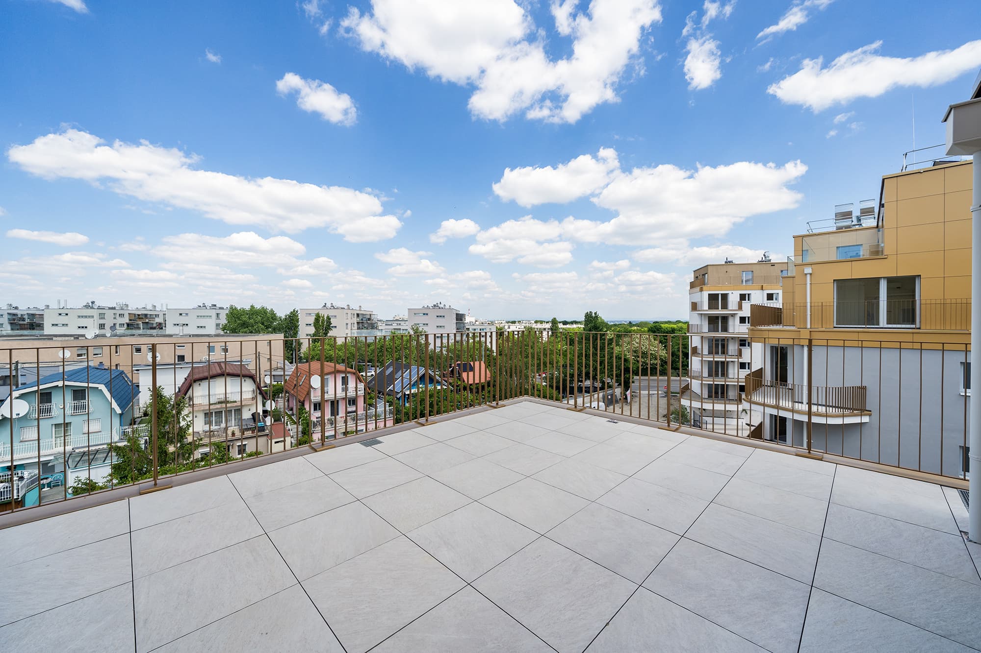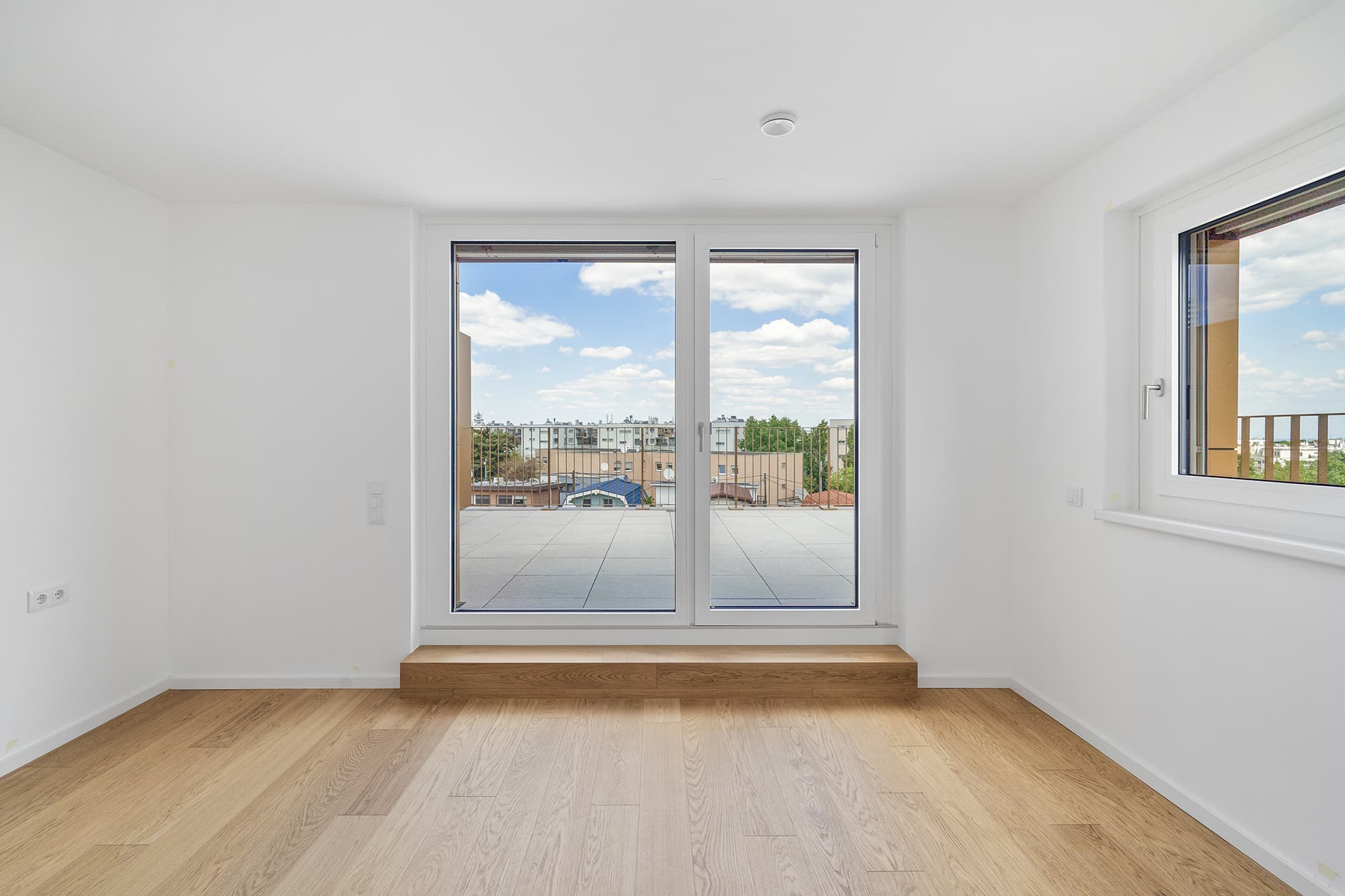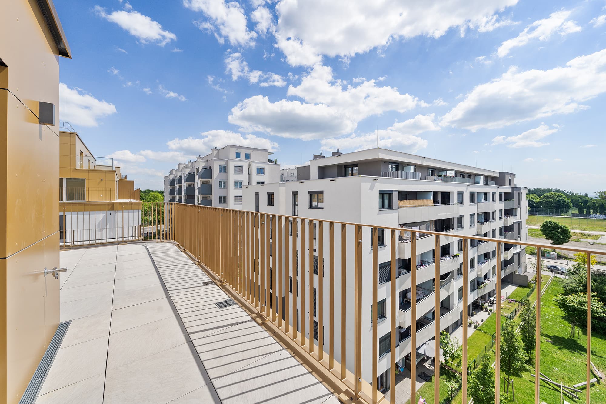 Die weißen Sockelfassaden sind von markanten Außenpunkten, floral geschwungenen Balkonen und Loggien, geprägt - die Dachgeschosse von weitläufigen Terrassen, mit weiten Ausblicken. Im Erdgeschoss setzen Eigengärten ein grünes Zeichen und mit dem direkt angrenzenden Kleingartenverein auf gute Nachbarschaft.