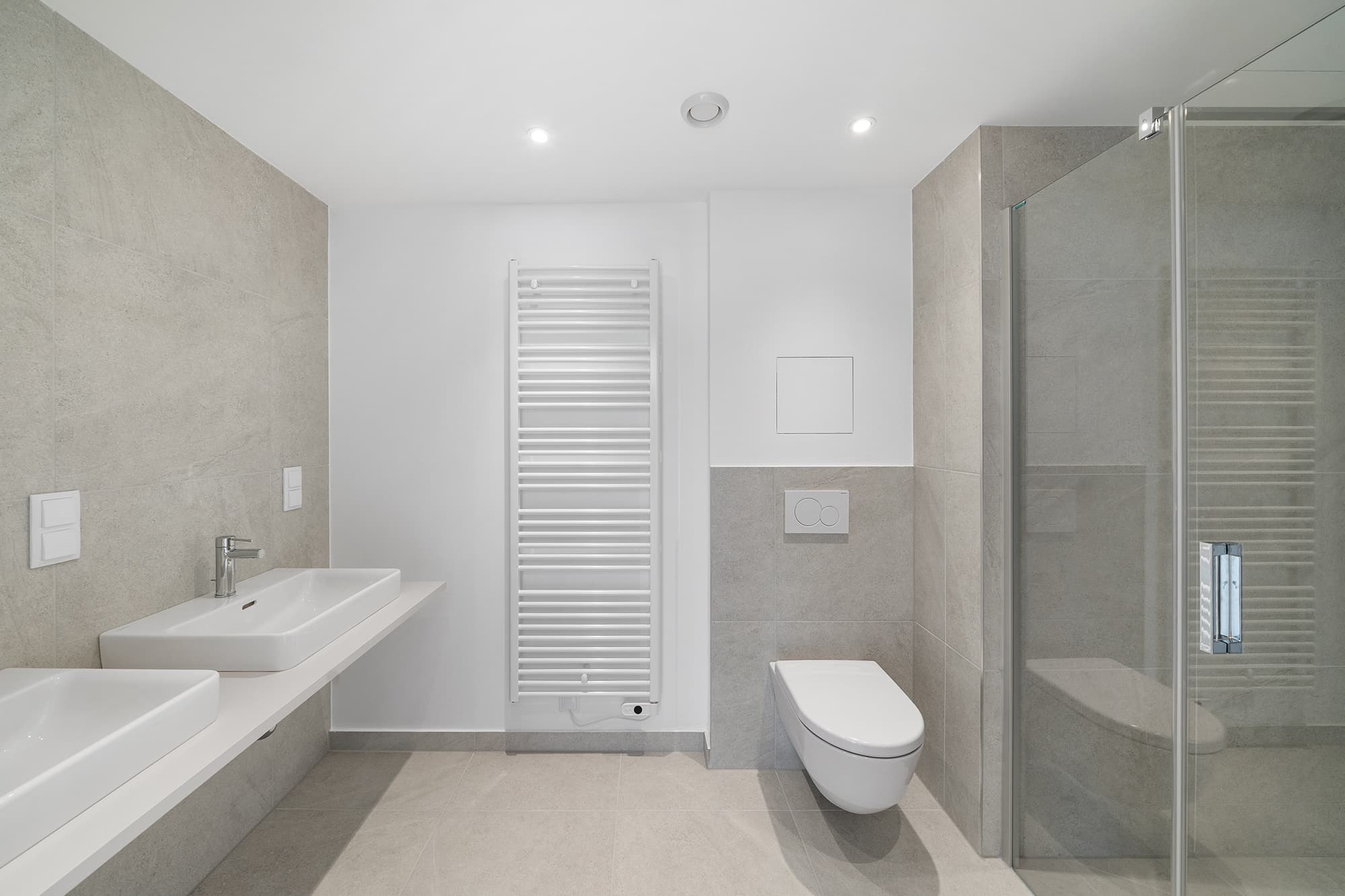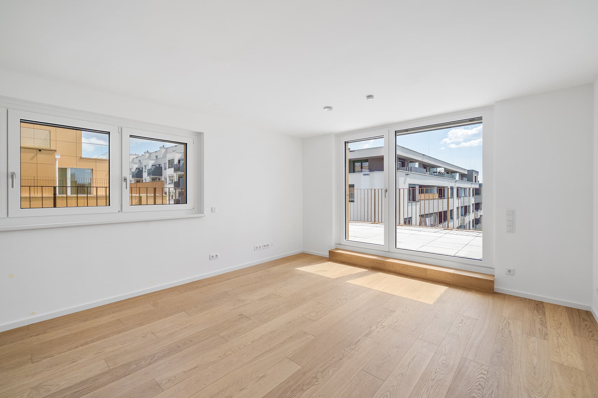 Ausstattung: // Sole/Wasser-Wärmepumpe mit Tiefenbohrungen // Heizen und (Teil-)Kühlen über oberflächennahe Bauteilaktivierung in der Decke // Kontrollierte Wohnraumlüftung mit Wärmerückgewinnung // Split-Klimaanlagen in den Dachgeschoss-Wohnungen // Bodenebene Walk-In Duschen mit Verglasung // Hochwertige Sanitärkeramik und Armaturen // geschmackvolle Verfliesung in den Sanitärbereichen // Langriemen-Eichen-Parkett // Raffstores (elektrisch bedienbar) // Einbruchhemmende Wohnungseingangstüren