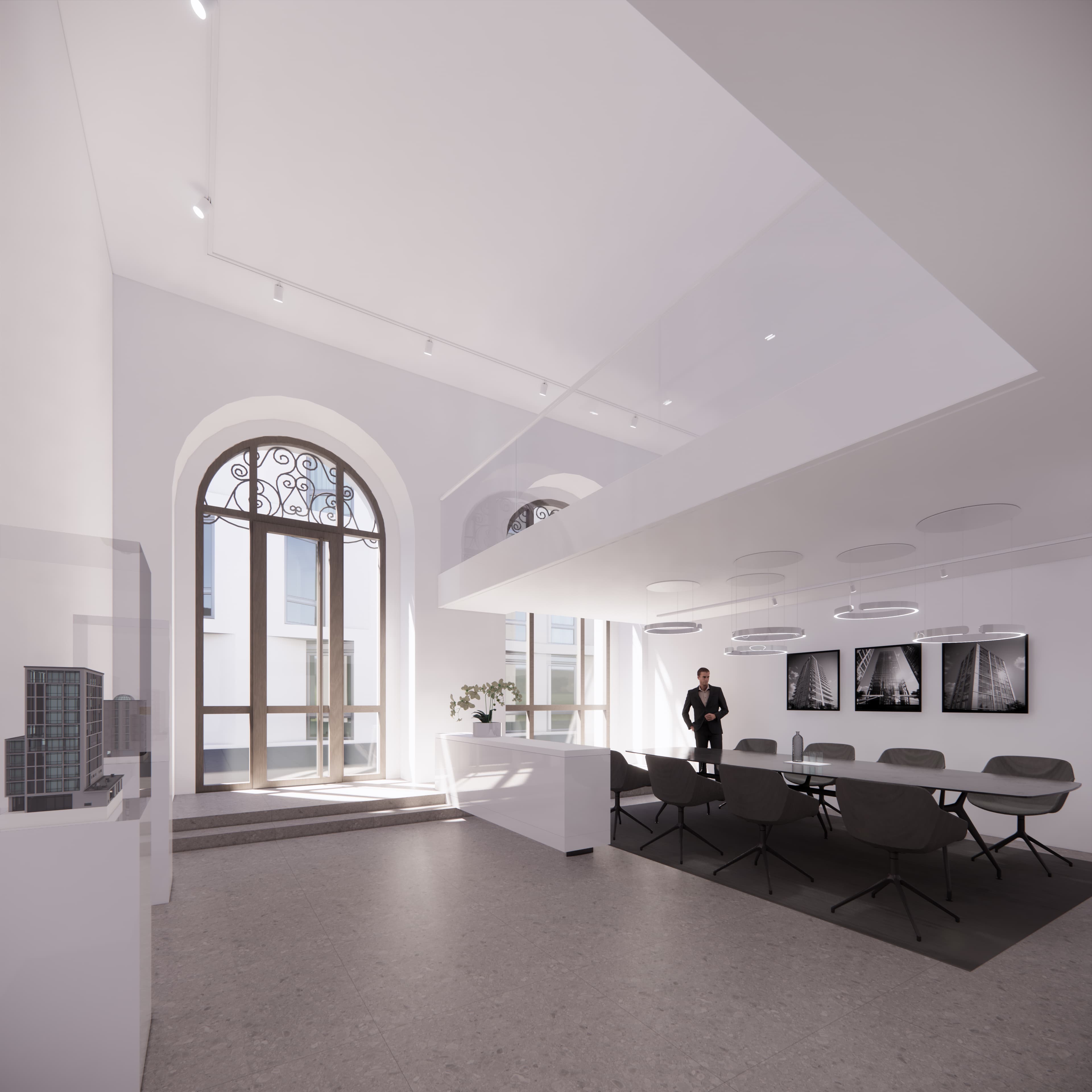Im Erdgeschoss des Hauses entstehen 3 exklusive Geschäfts-/Büroflächen. Besonders hervorzuheben sind die großzügigen, straßenseitigen Fensterportale, die nicht nur für eine hervorragende Belichtung sondern auch eine ideale Sichtbarkeit sorgen. Raumhöhen von bis zu 5,5m im Eingangsbereich verleihen den Fläche eine außergewöhnliche Großzügigkeit und unterstreichen den exklusiven Charakter.
