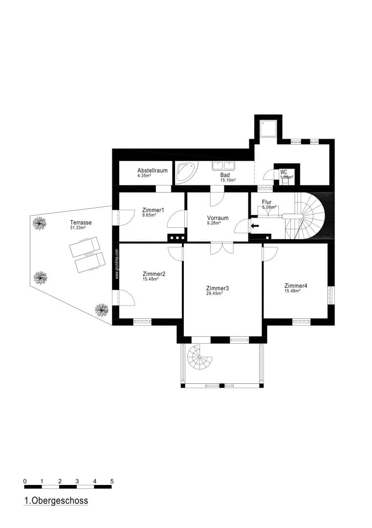 1. Obergeschoss // Wohnsalon // 3 Schlafzimmer // 1 großes Badezimmer mit Wanne, Dusche, WC // Wirtschaftsraum