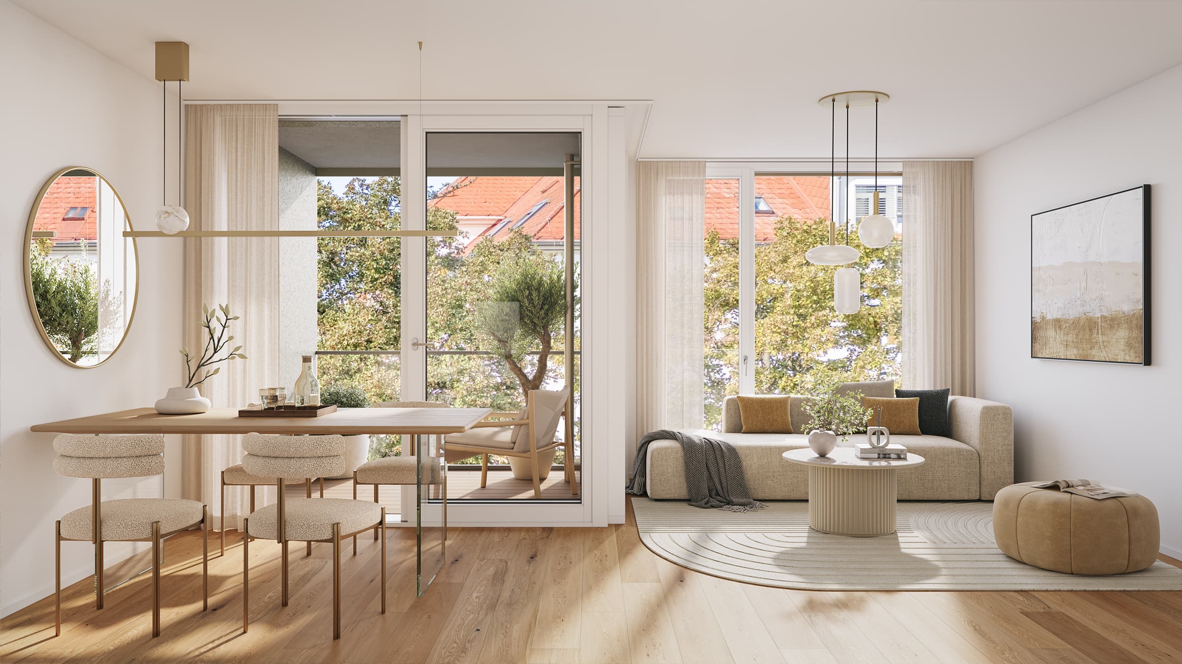Großflächige Verglasungen prägen das äußere Erscheinungsbild. Im Inneren überzeugen die Grundrisse durch Offenheit und Flexibilität. Raumhohe, breite Fenster lassen das Tageslicht tief in die Wohnräume fluten und schaffen eine luftige, großzügige Wohnatmosphäre.