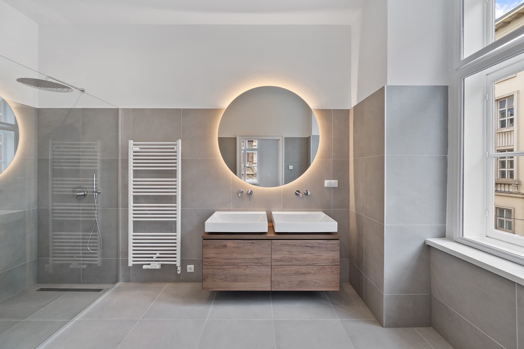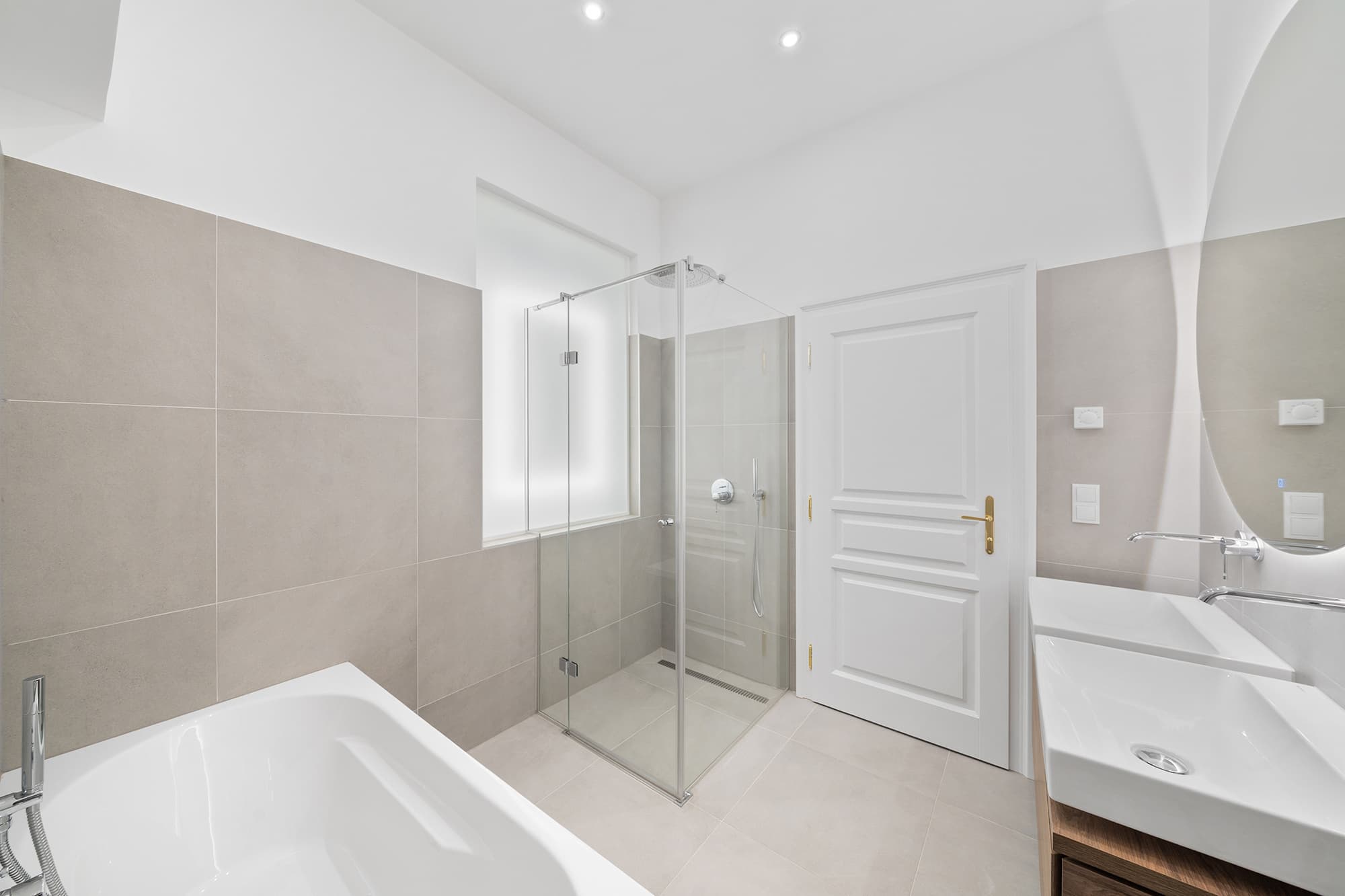 // Gäste-Badezimmer mit Dusche, Badewanne und Doppelwaschbecken