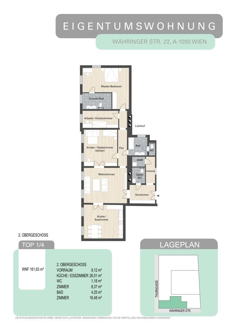 Die Wohnung liegt im 2. Obergeschoß, ist großzügig geschnitten und bietet auf ca. 160 m² Wohnfläche durchdachte Raumaufteilung und höchsten Wohnkomfort. Neben einem einladenden Vorraum und einem anschließendem Ankleidezimmer bietet die Wohnung ein geräumiges Wohnzimmer, zwei Schlafzimmer sowie ein Masterbedroom mit angeschlossenem en suite Badezimmer.