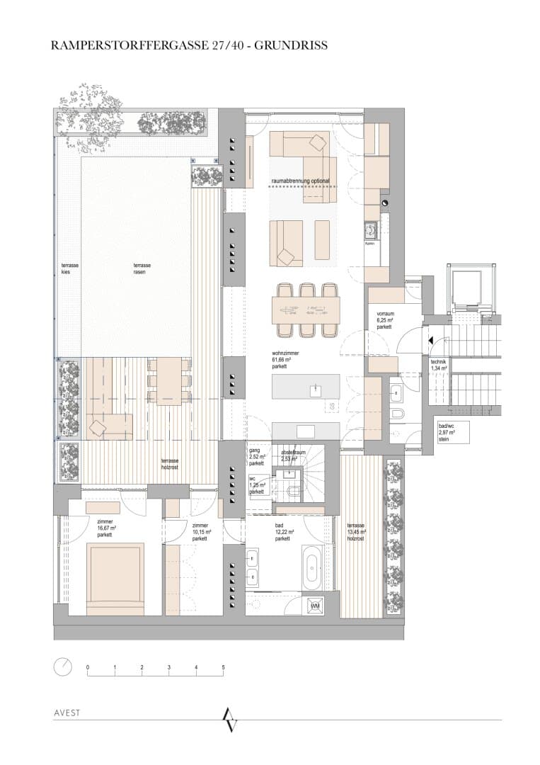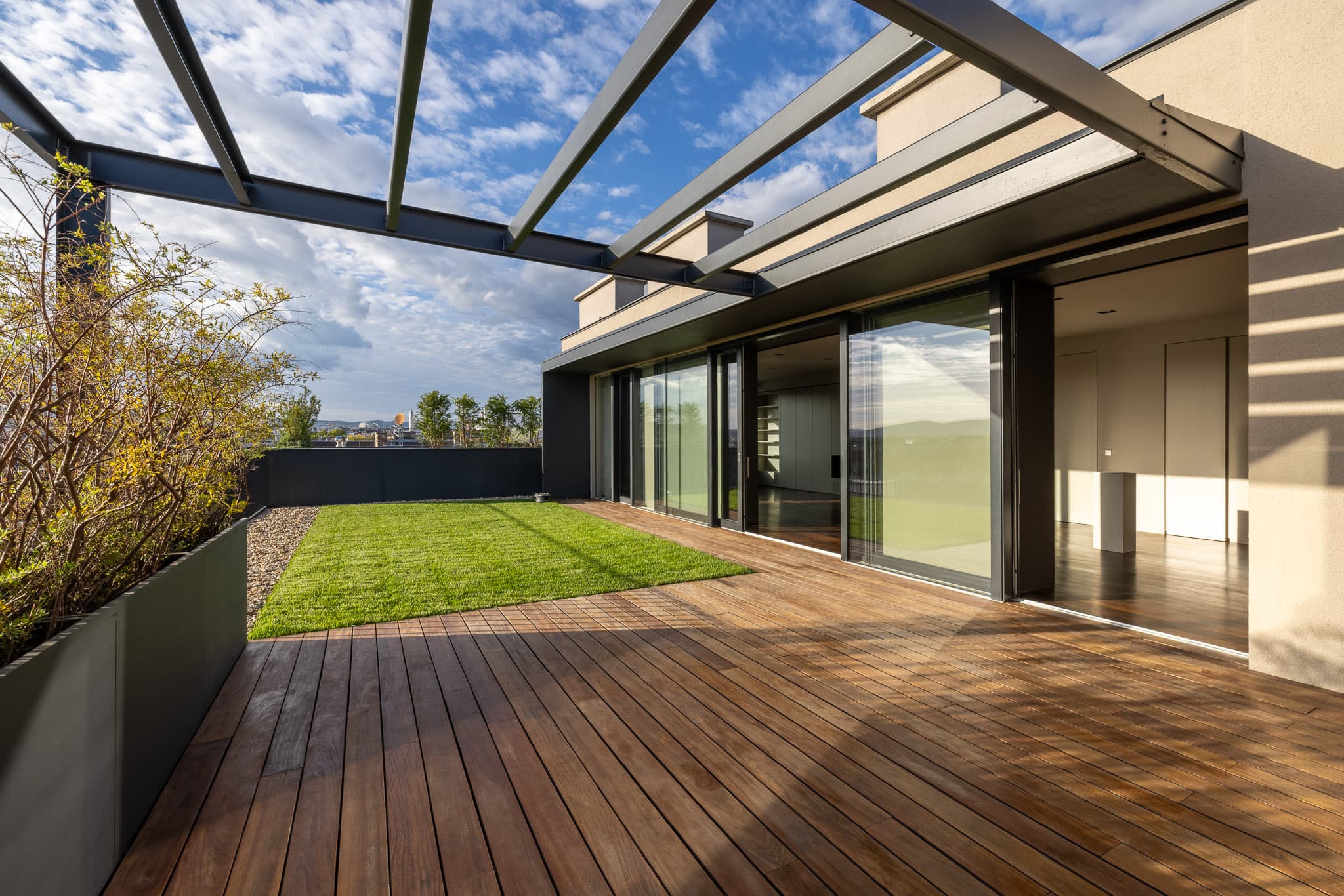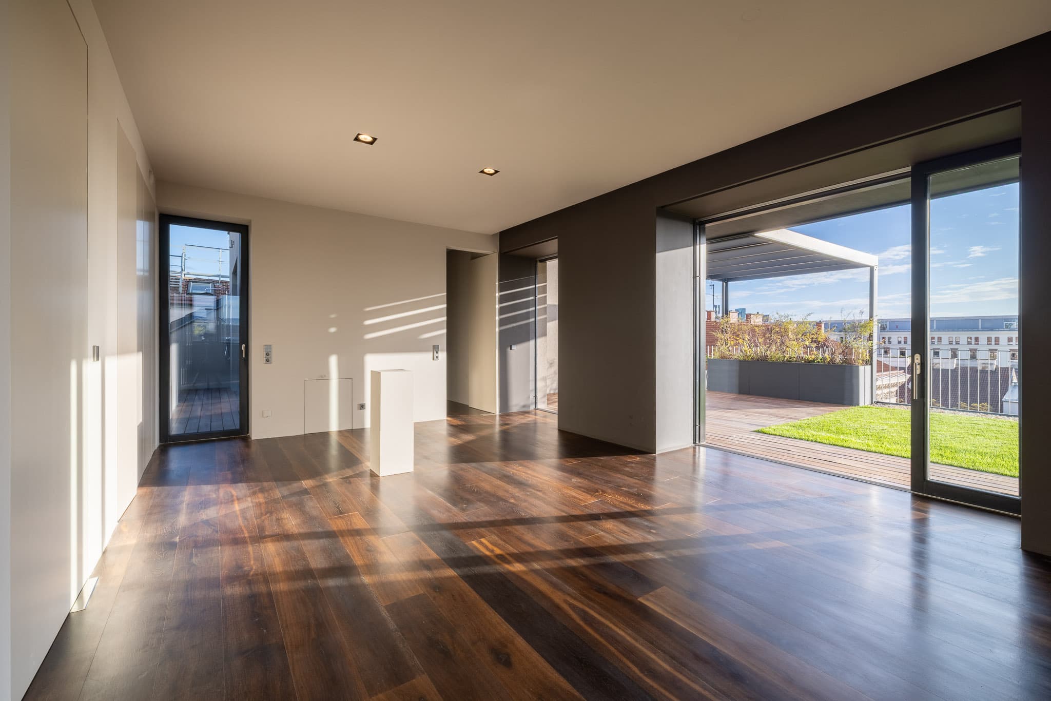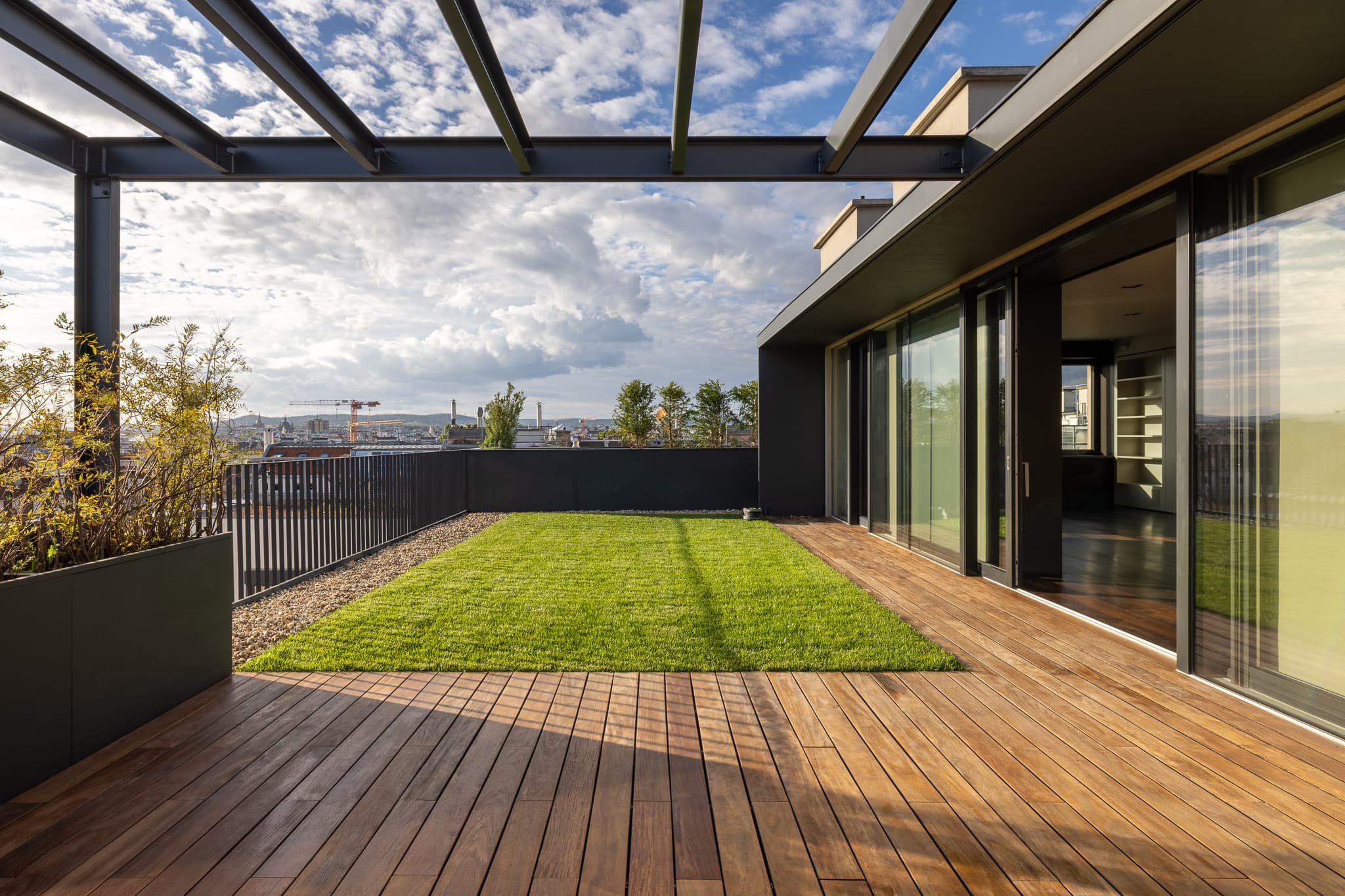 Besonderheiten // Penthouse und Gartenterrasse auf einer Ebene // Raumhöhe 2,90 // Ziegelmassivbauweise // Terrassenschiebe-Elemente und Innentüren 2,5m // Josko Holz-Aluminium Fenster // Smart-Home System (Loxone) // Kontrollierte Wohnraumlüftung // Fussbodenheizung // Hochwertige Eichen-Parkettdielen // Josko Holz-Aluminium Fenster // elektrische Aussenraffstores // LED-Innenbeleuchtung und Einbaustrahler // offener Kamin Ruegg // massgefertigte Tischlermöbel/System // Rasenroboter // Terrassenbegrünung in Trögen // Terrassenpergola // Bewässerungsanlage // Gartenbeleuchtung // Terrassendusche // Anschluss für eine Terrassenheizung // Grünruhelage // Parkblick // unverbaubarer Fernblick // Luftwärmepumpe und PV-Paneele nachrüstbar