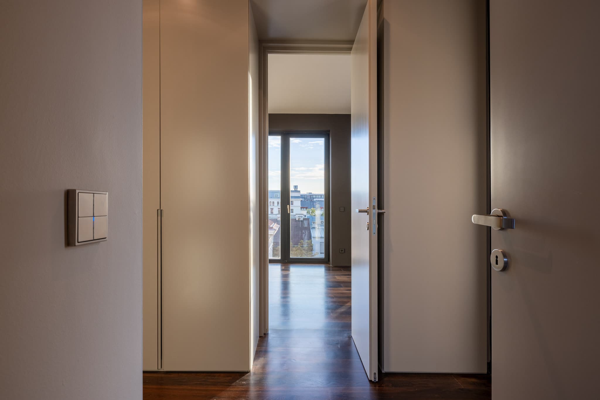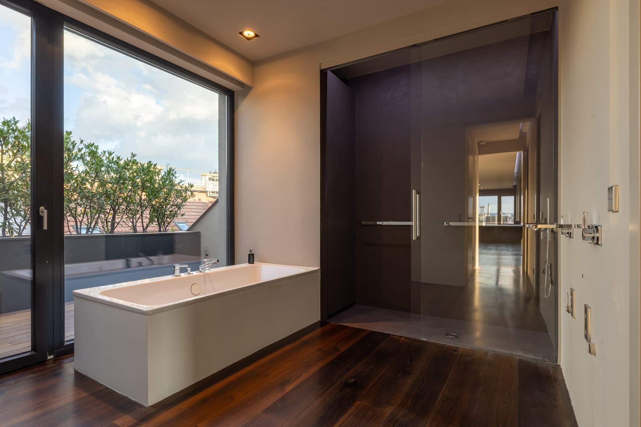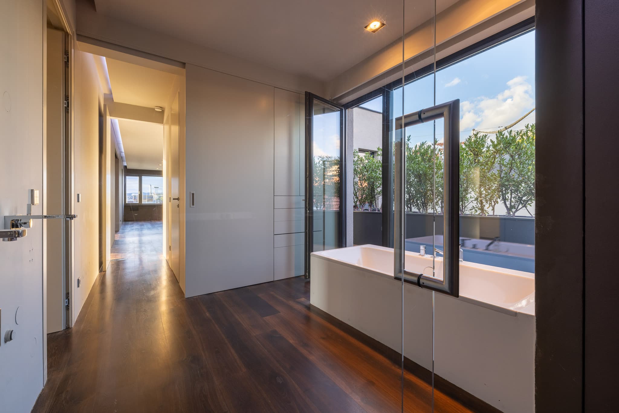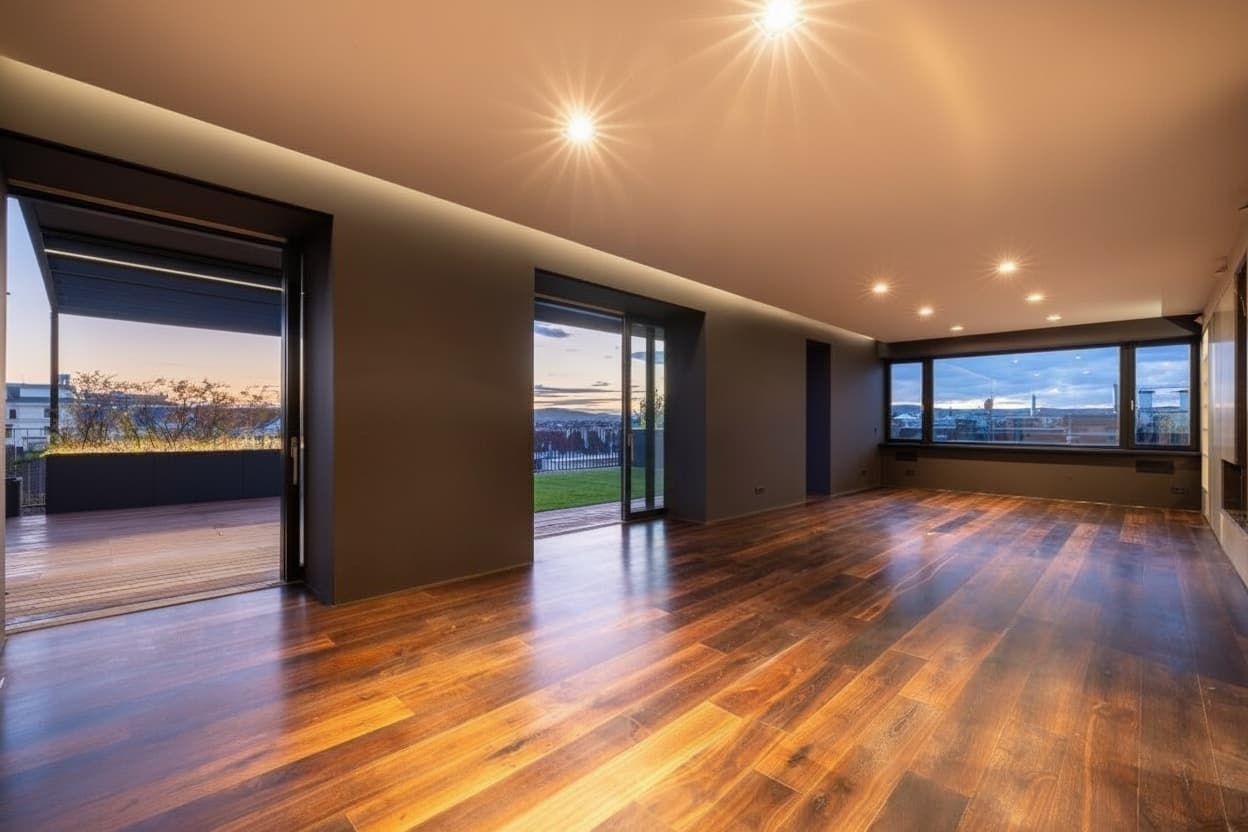 Besonderheiten // Penthouse und Gartenterrasse auf einer Ebene // Raumhöhe 2,90 // Ziegelmassivbauweise // Terrassenschiebe-Elemente und Innentüren 2,5m // Josko Holz-Aluminium Fenster // Smart-Home System (Loxone) // Kontrollierte Wohnraumlüftung // Fussbodenheizung // Hochwertige Eichen-Parkettdielen // Josko Holz-Aluminium Fenster // elektrische Aussenraffstores // LED-Innenbeleuchtung und Einbaustrahler // offener Kamin Ruegg // massgefertigte Tischlermöbel/System // Rasenroboter // Terrassenbegrünung in Trögen // Terrassenpergola // Bewässerungsanlage // Gartenbeleuchtung // Terrassendusche // Anschluss für eine Terrassenheizung // Grünruhelage // Parkblick // unverbaubarer Fernblick // Luftwärmepumpe und PV-Paneele nachrüstbar