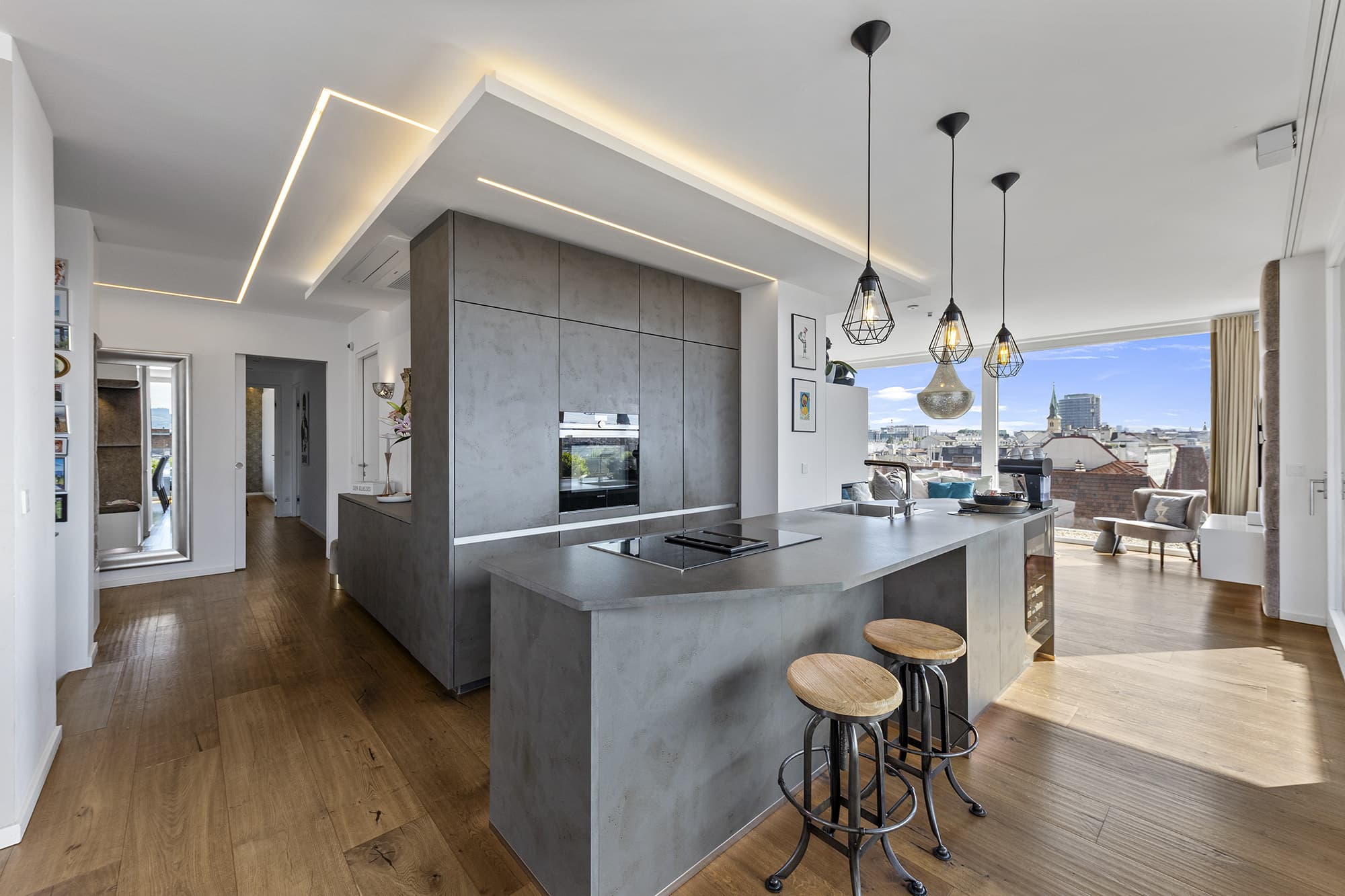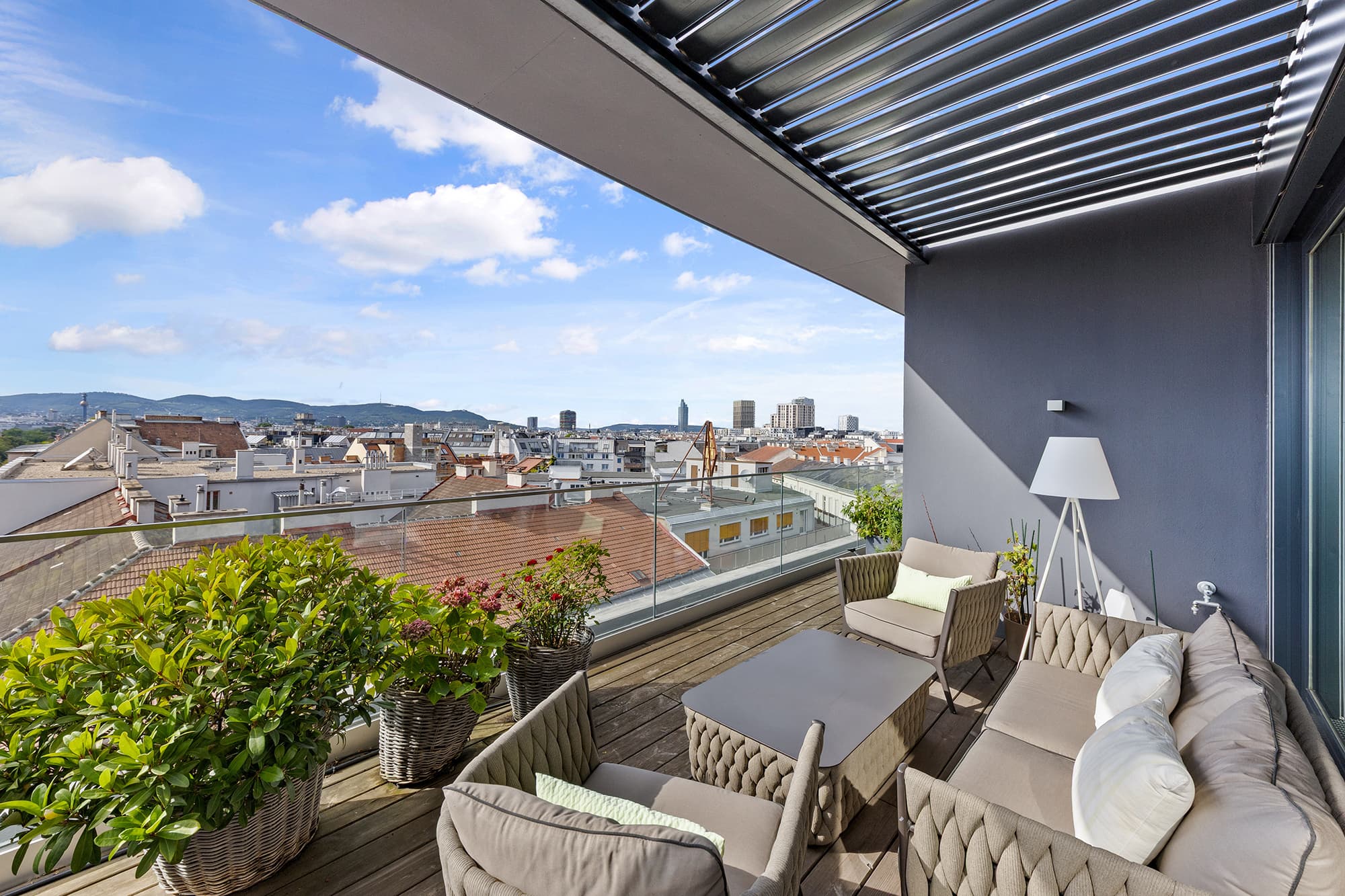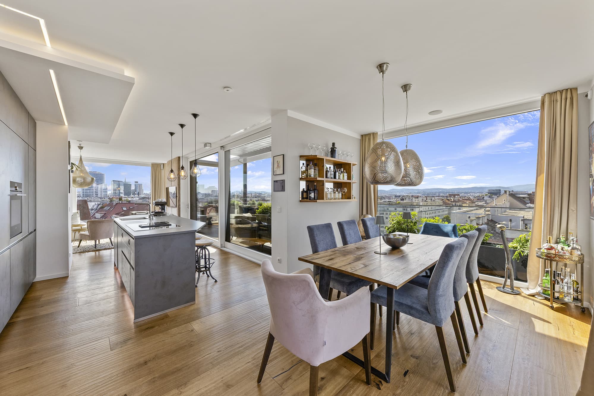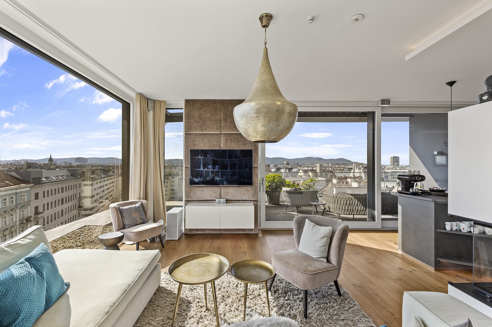 Schon auf der Wohnebene liegt der Blick frei über die Dächer Wiens. Die großzügigen Terrassenflächen lassen die Grenzen zwischen innen und außen verschwimmen und bieten eine ganz außergewöhnliche Atmosphäre.
