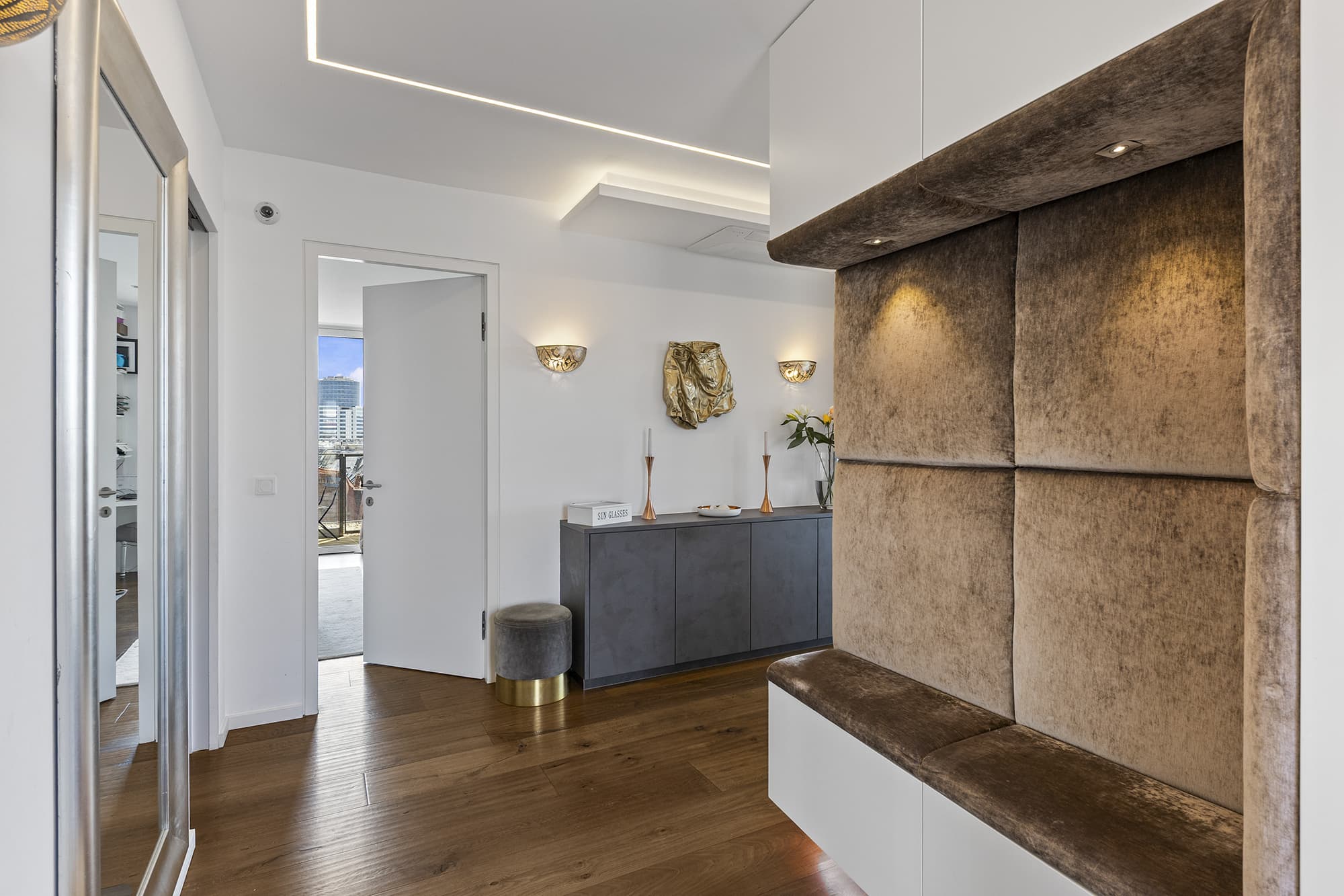Die hohe Ausstattungsqualität, in stilsicherer Ausführung, kombiniert mit dem durchdachten Grundriss und den durchgehend lichtdurchfluteten Räumen ohne Dachschrägen, verleihen der Wohnung bereits ab dem Entree eine besonders ansprechende Wirkung.