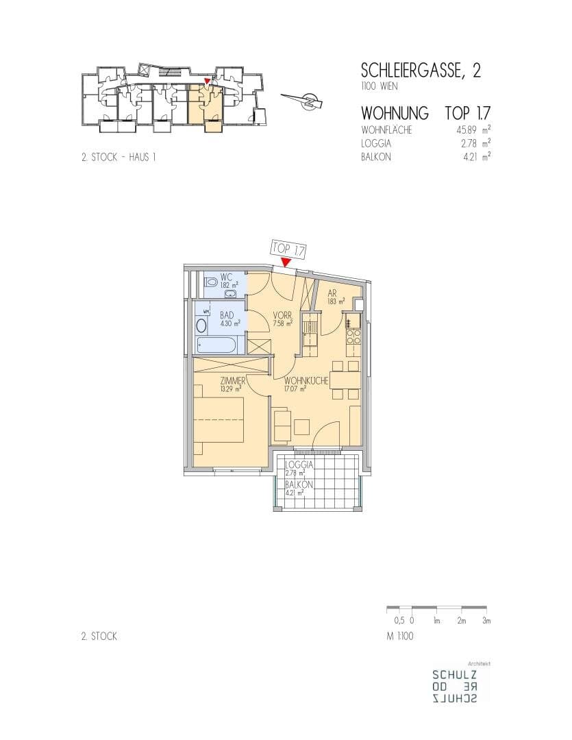 Raumaufteilung // Vorzimmer // Wohnküche // Schlafzimmer // Badezimmer // separates WC // Abstellraum // Loggia // Balkon